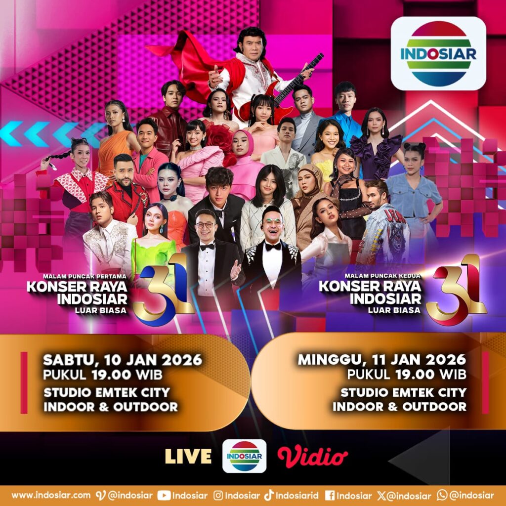 Saksikan rangkaian kemeriahan perayaan HUT ke-31 Indosiar lewat perayaan Malam Puncak Pertama Konser Raya 31 Indosiar Luar biasa pada Sabtu, 10 Januari 2026 dan Malam Puncak Kedua Konser Raya 31 Indosiar Luar biasa, pada Minggu, 11 Januari 2026.