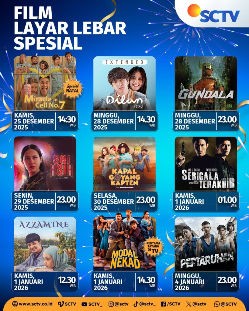 Rangkaian Film Layar Lebar Spesial juga akan menemani pemirsa sepanjang akhir tahun. Beragam genre film Indonesia dihadirkan, mulai dari drama keluarga, romantis, komedi petualangan, hingga aksi laga yang menegangkan.