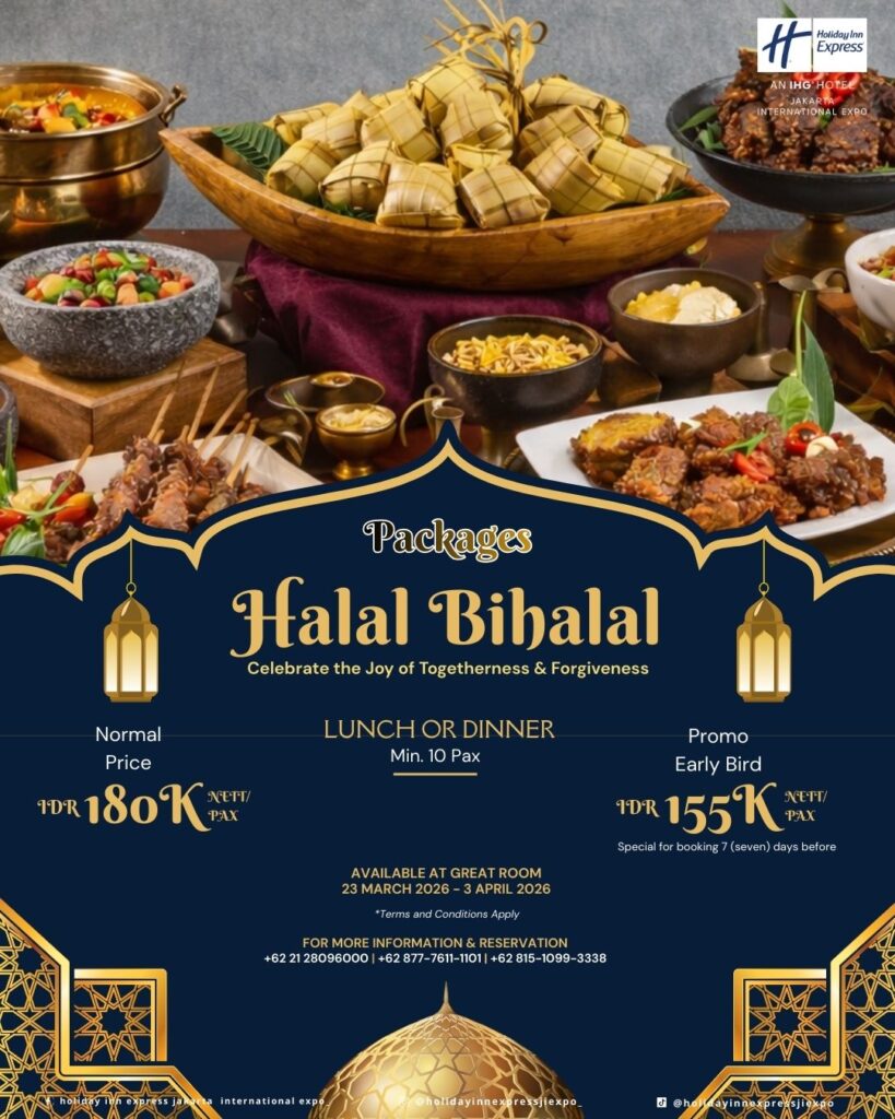 Promo Halal Bihalal ini tersedia mulai 23 Maret hingga 3 April 2026 di Great Room Restaurant Holiday Inn Express Jakarta International Expo, menjadikannya pilihan tepat bagi perusahaan, komunitas, maupun keluarga yang ingin merayakan kebersamaan setelah Hari Raya.